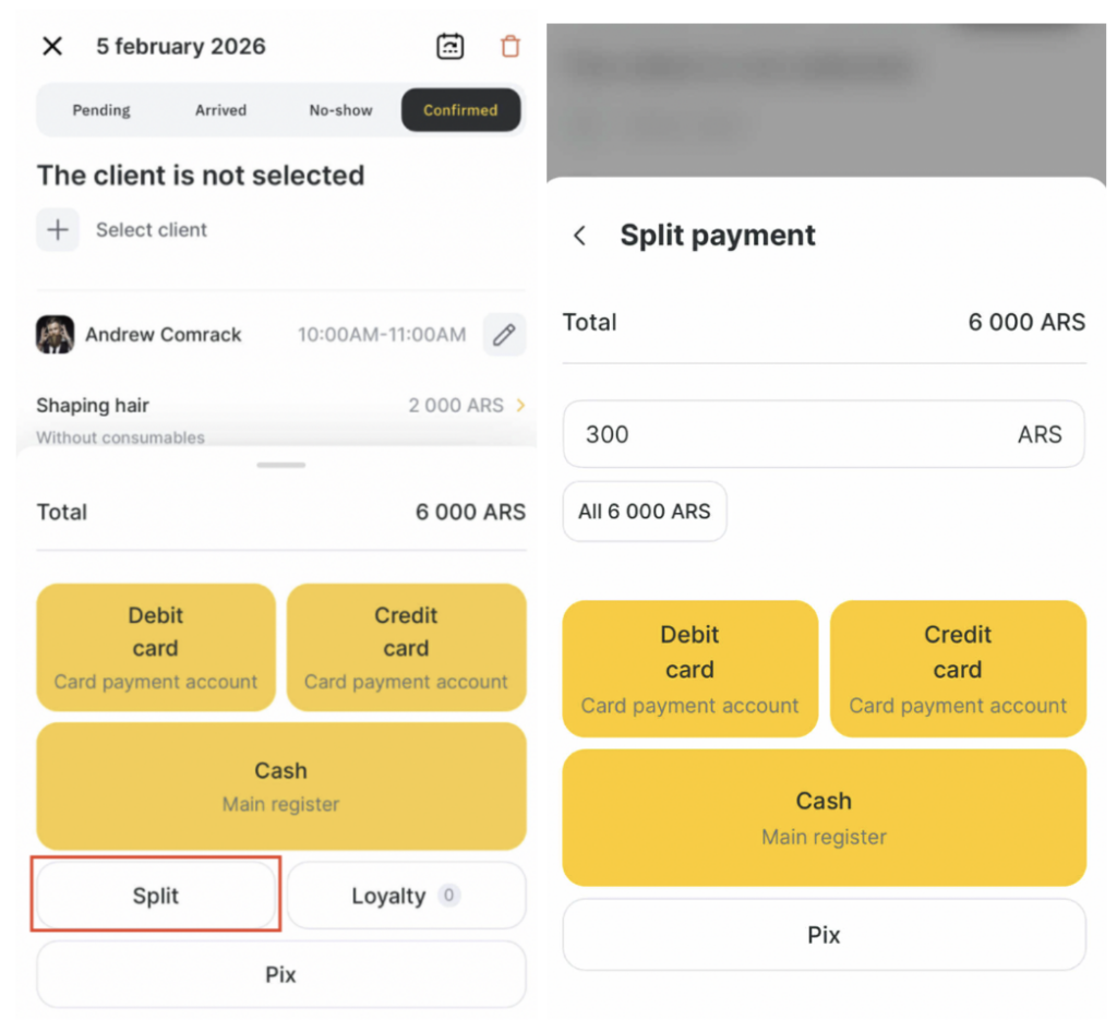 You can pay for the appointment using the quick payment buttons: Cash and Card, or Split payment.