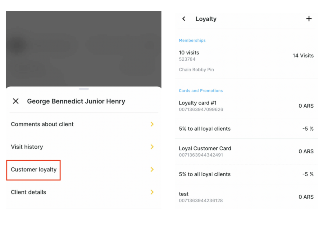 - Customer loyalty. Here you can view information on loyalty programs valid for the client (cards, promotions, memberships and gift cards), and issue a card. Loyalty is configured in the chain interface in the web version of the program. See the detailed information here.