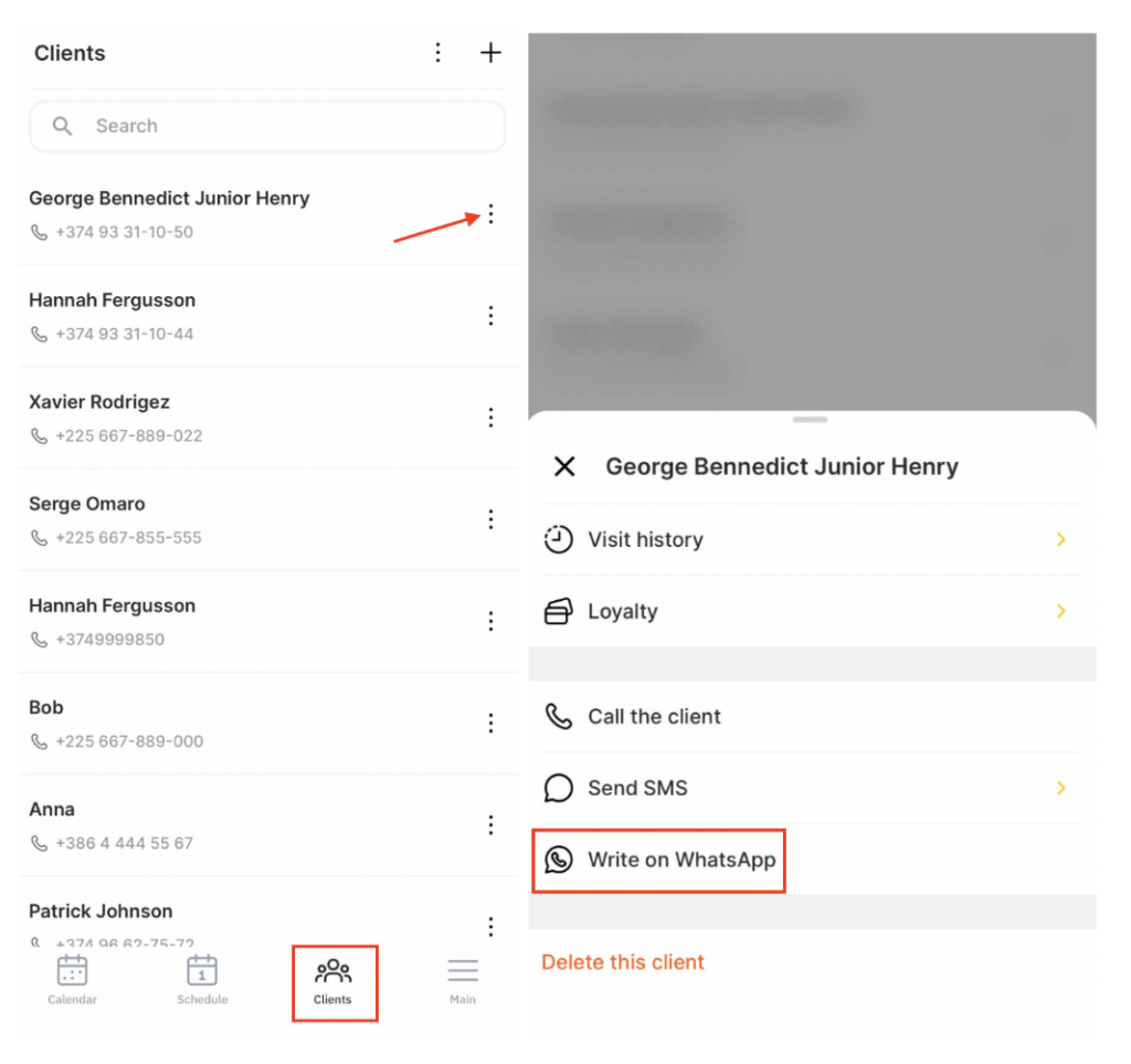 - Tap the menu (three dots) next to the selected client’s name or inside the client profile, and select Write on WhatsApp.
