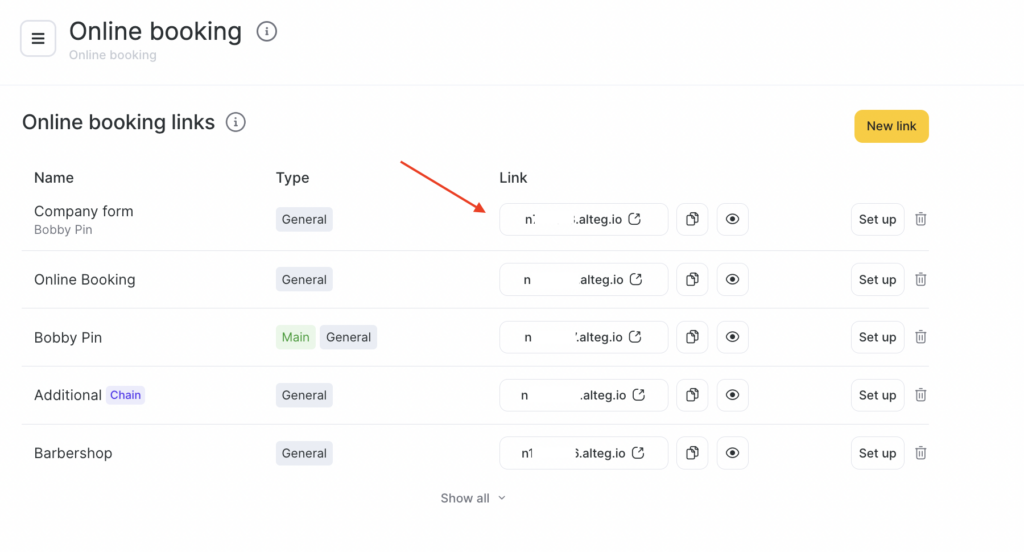 - Copy the link to the online booking form (a link in the nXXXXXX.alteg.io format is shown to the right of the form name).