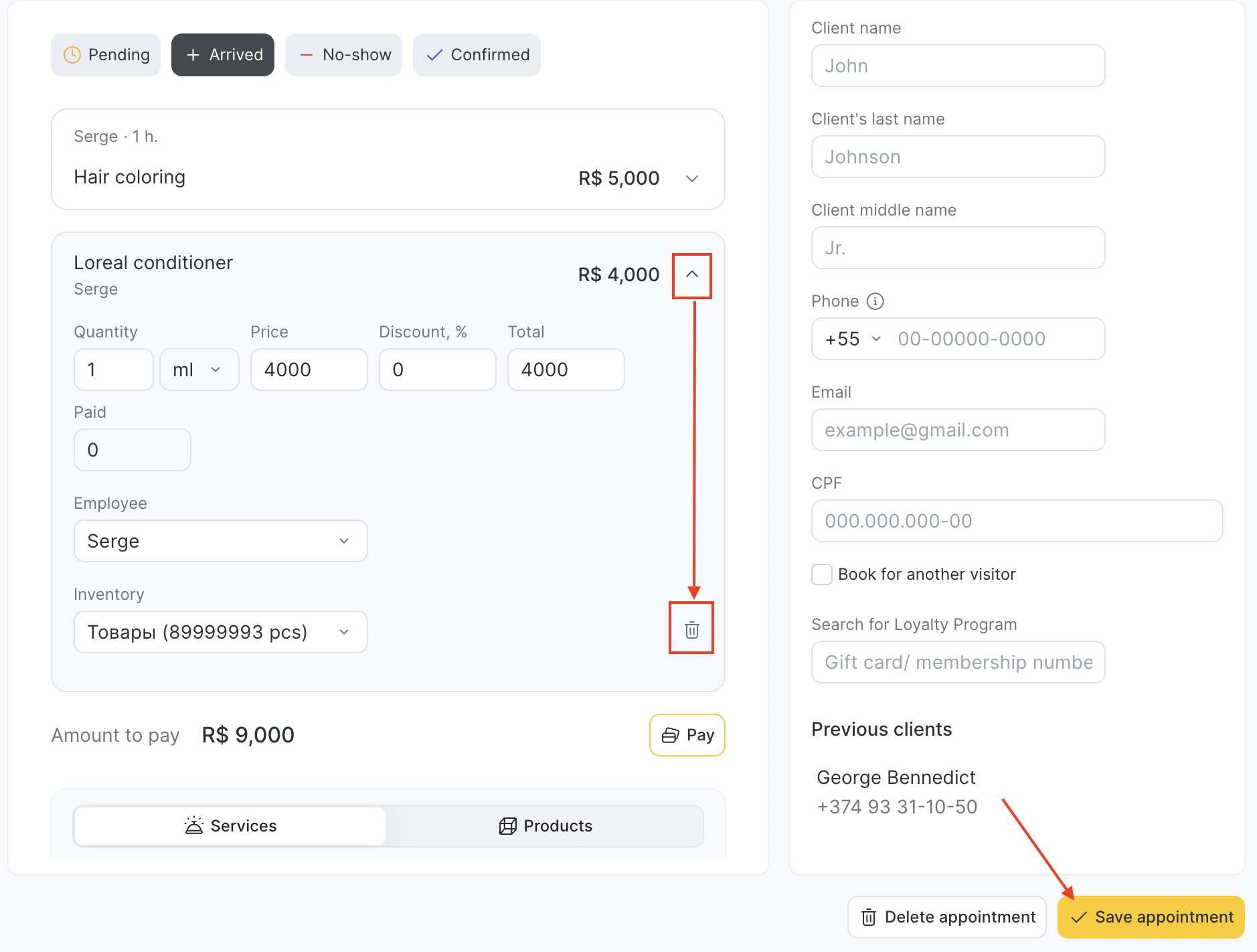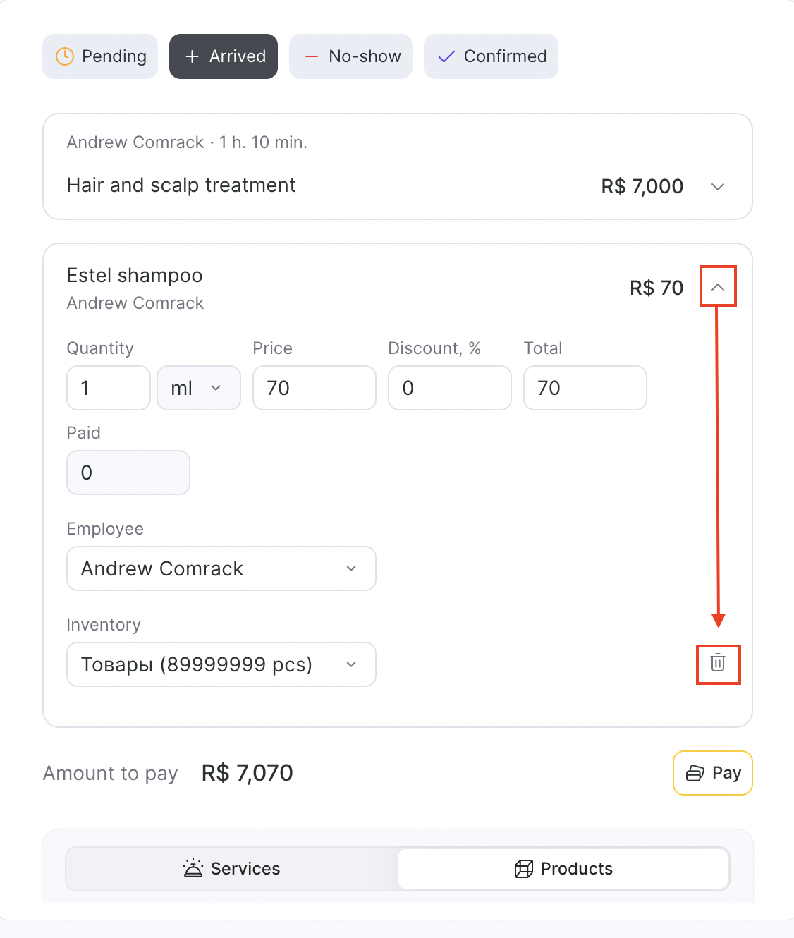 Open the appointment and go to the “Payment” tab. Next to the name of the service/product, click the downward arrow icon. A new line will appear showing the account where the payment was made, the amount, and a trash-bin icon. Click the trash-bin icon to cancel the payment — the financial transaction will then be deleted.