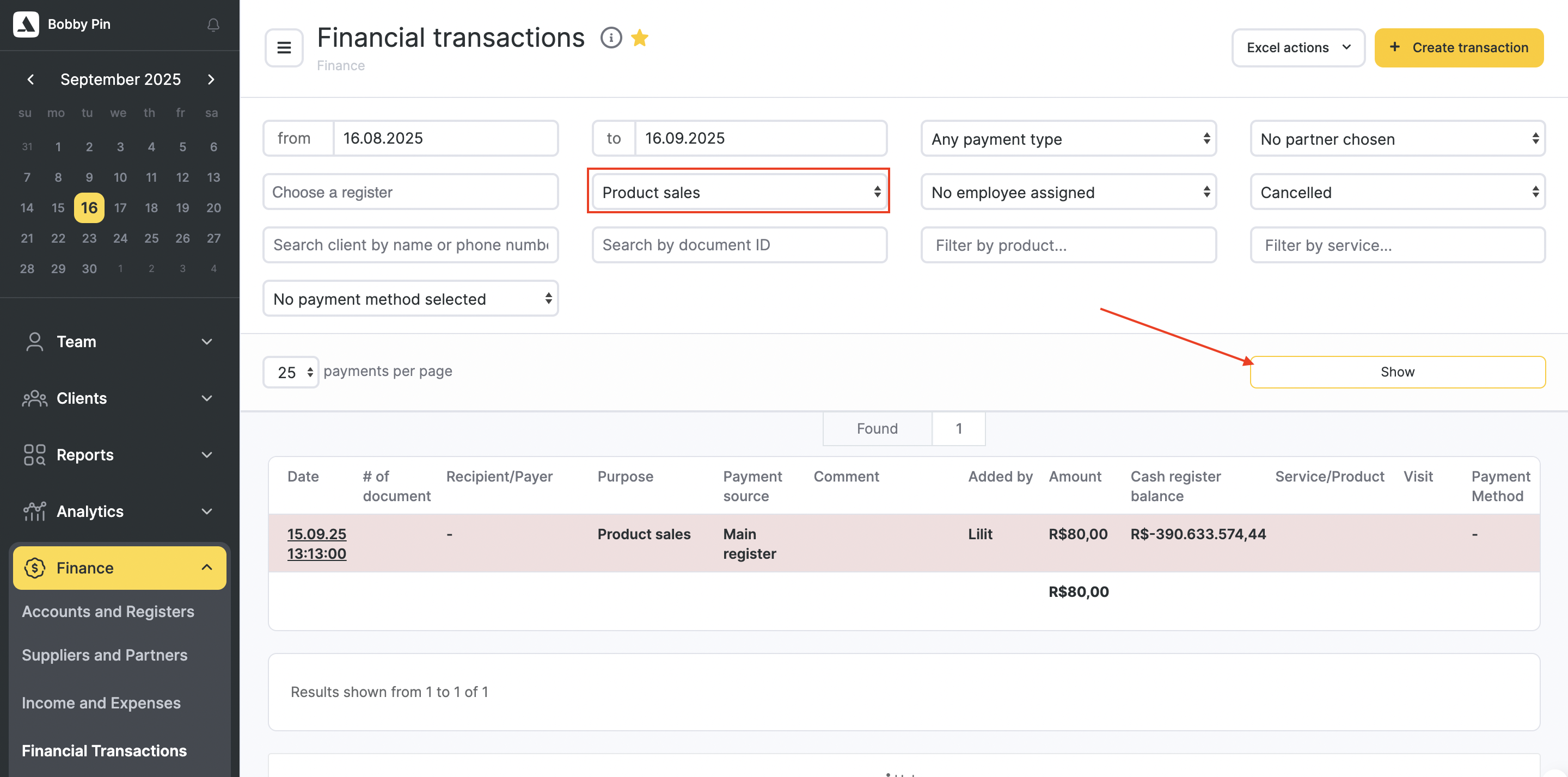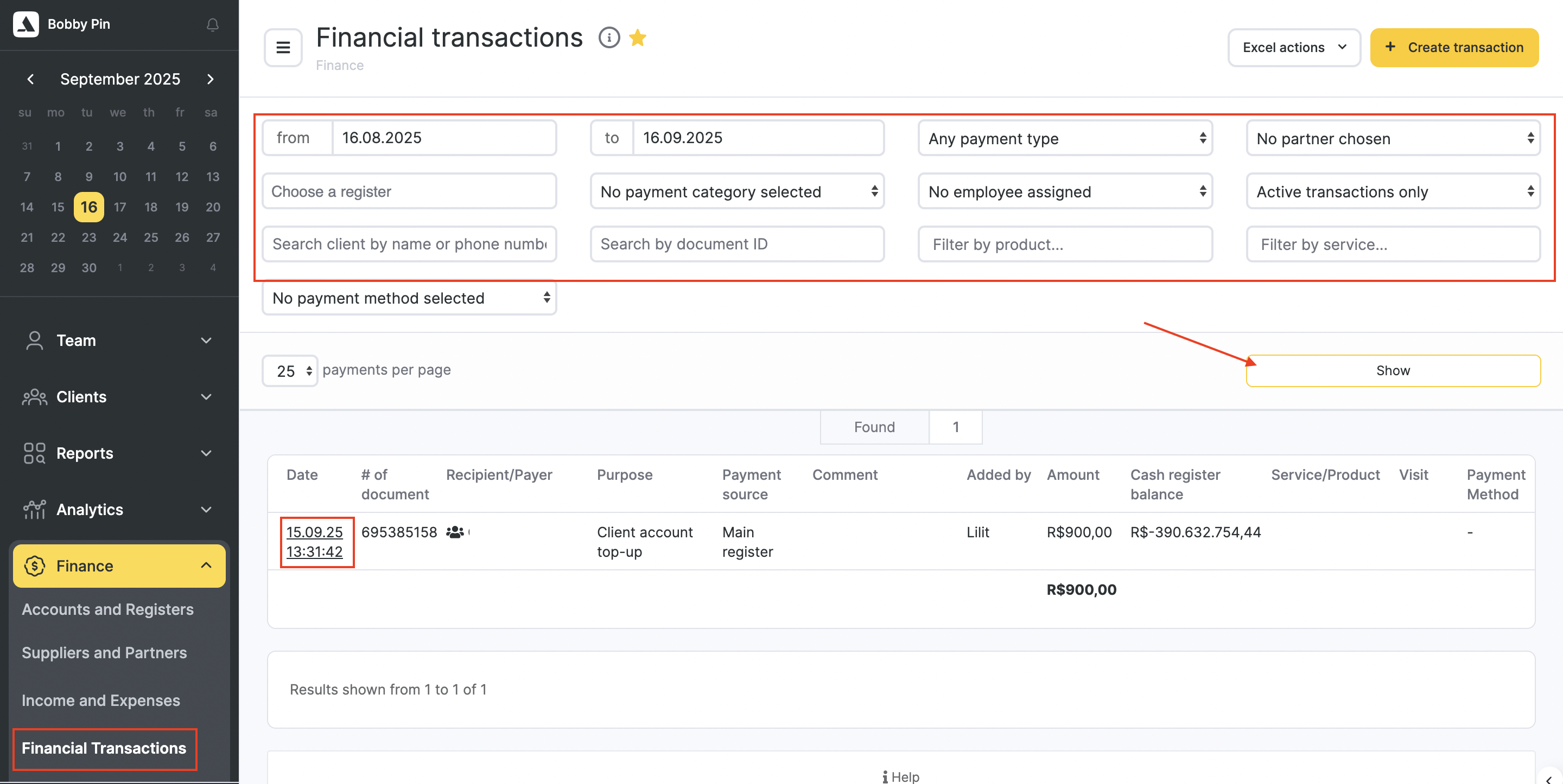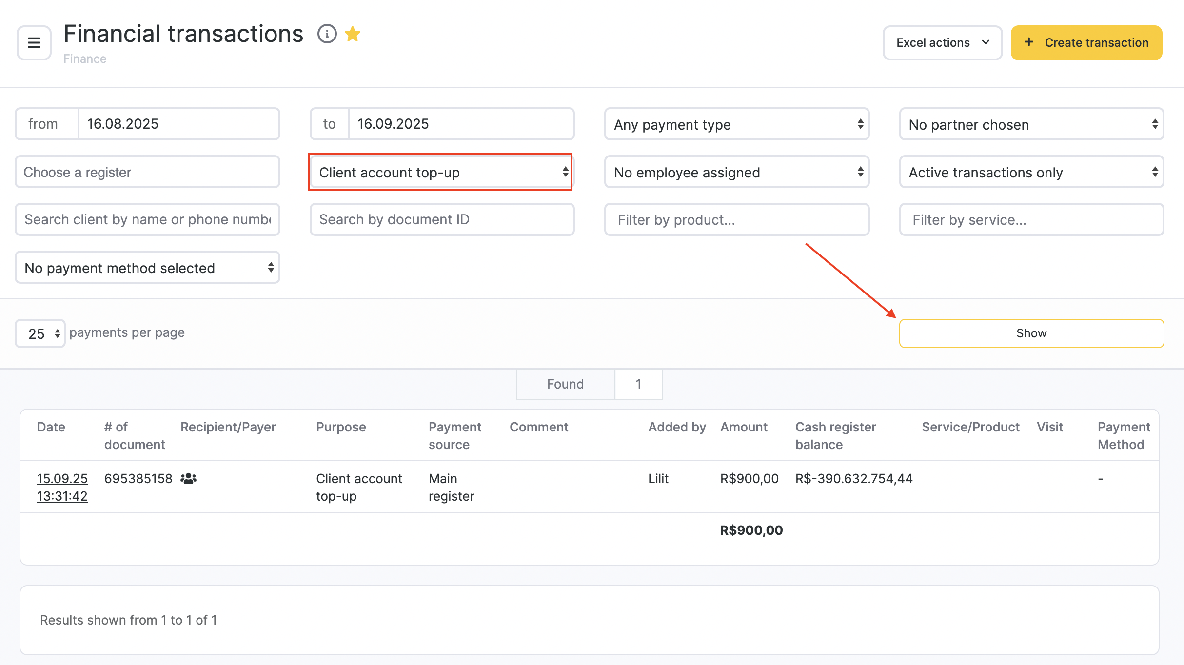 - Go to Finance > Financial Transactions and find the required transaction. For quick search, use the Payment Item filter “Account Top-Up,” select the necessary dates, and, if needed, enter the customer’s name or phone number. Then click “Show.”
