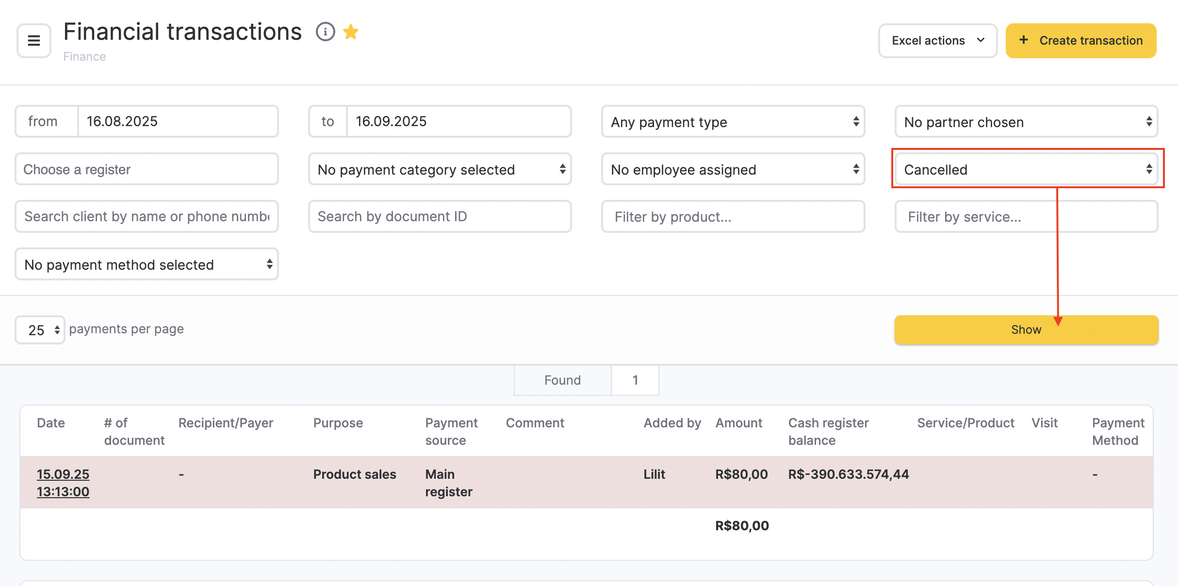Information about the canceled payment will remain in Finance > Financial Transactions. To find deleted transactions, set the filter to “Canceled” and then click “Show.”