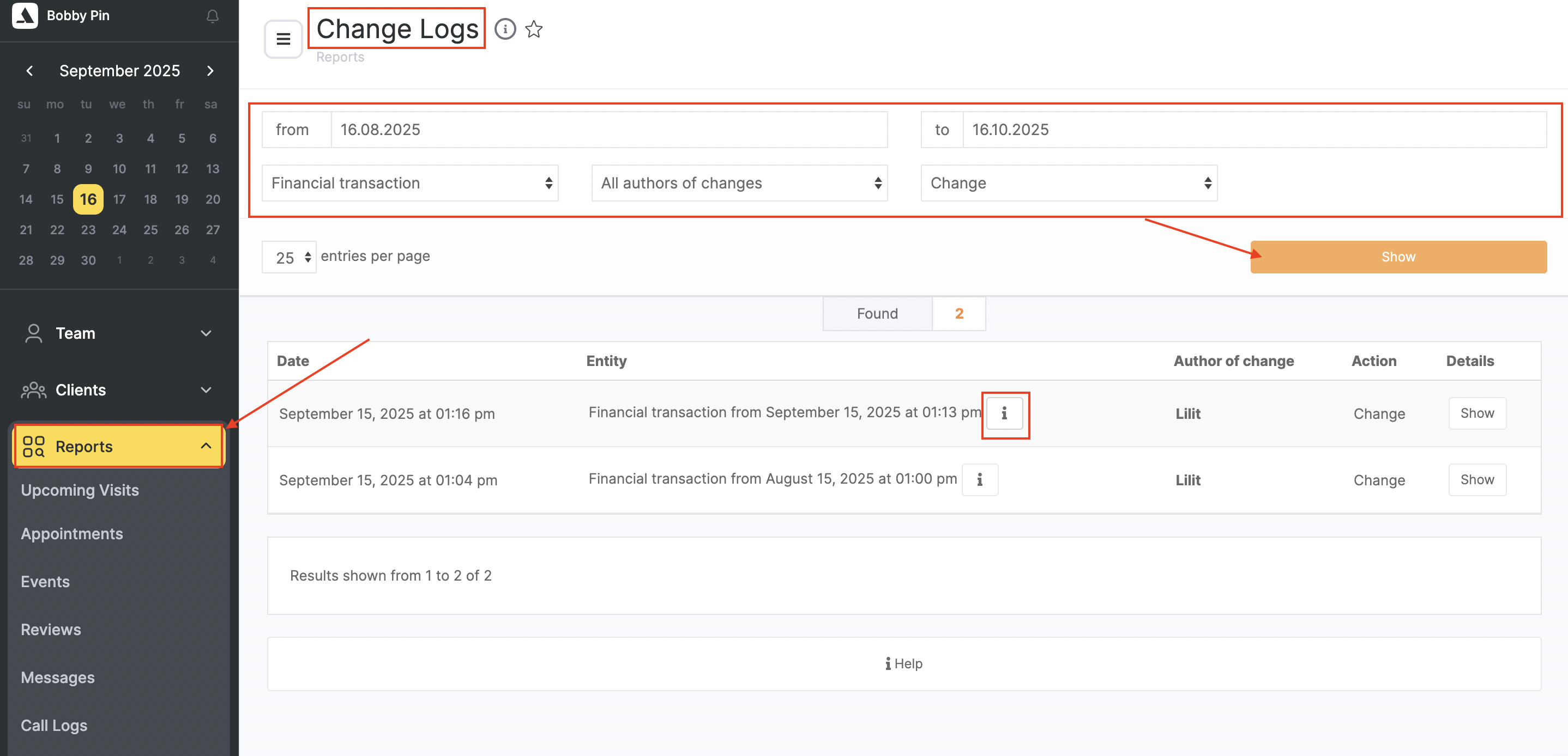 Information about deleted transactions will also appear in Reports > Change Logs. In this section, you can see which user added, changed, or deleted a payment, at what time, and view additional details and data.