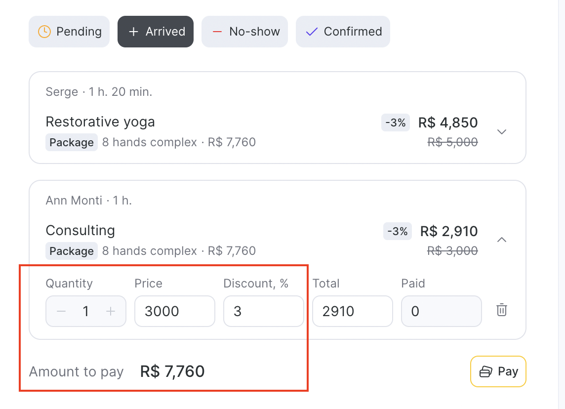 - Go to the “Visit Status” section and specify either the discount granted to the customer or the amount that should remain paid for this service. If you enter the payable amount directly, the “Discount” field will automatically be filled in.