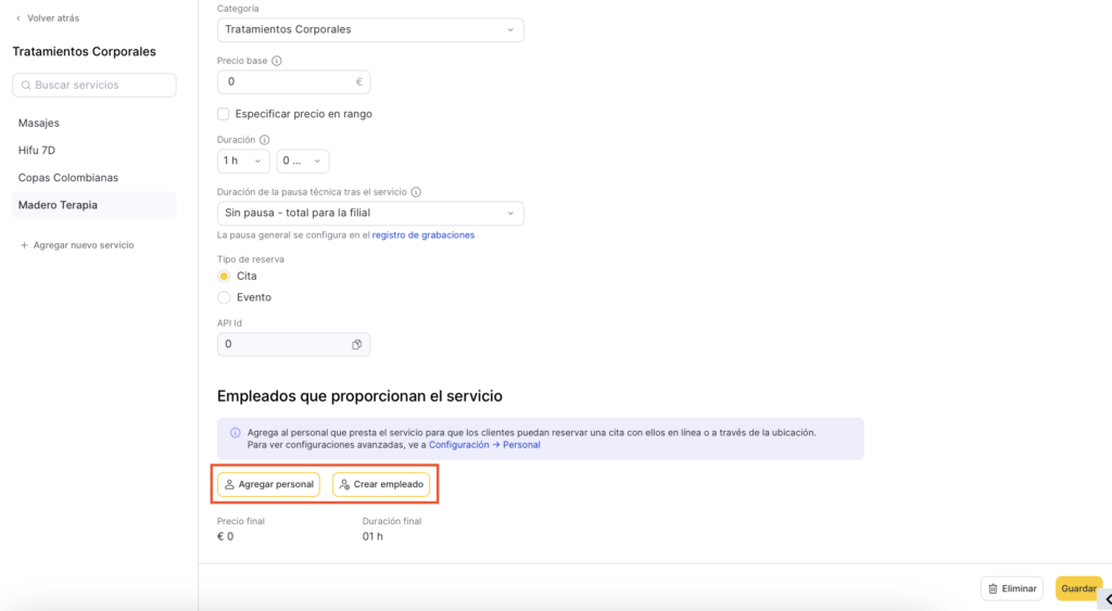 - En la nueva ventana, la pestaña Configuraciones principales se abrirá de forma predeterminada. Para asignar un miembro del equipo al servicio, haz clic en el botón Agregar Personal.(También puedes crear un nuevo miembro del equipo sin salir de esta sección haciendo clic en Crear empleado).
