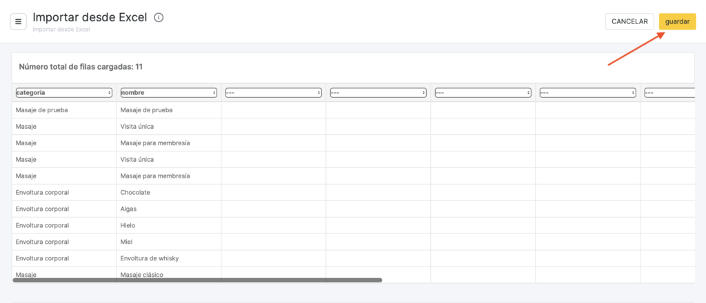 No es necesario crear nuevas categorías con anticipación.Si estás importando servicios en categorías existentes, asegúrate de que los nombres en el sistema y en la tabla coincidan exactamente.