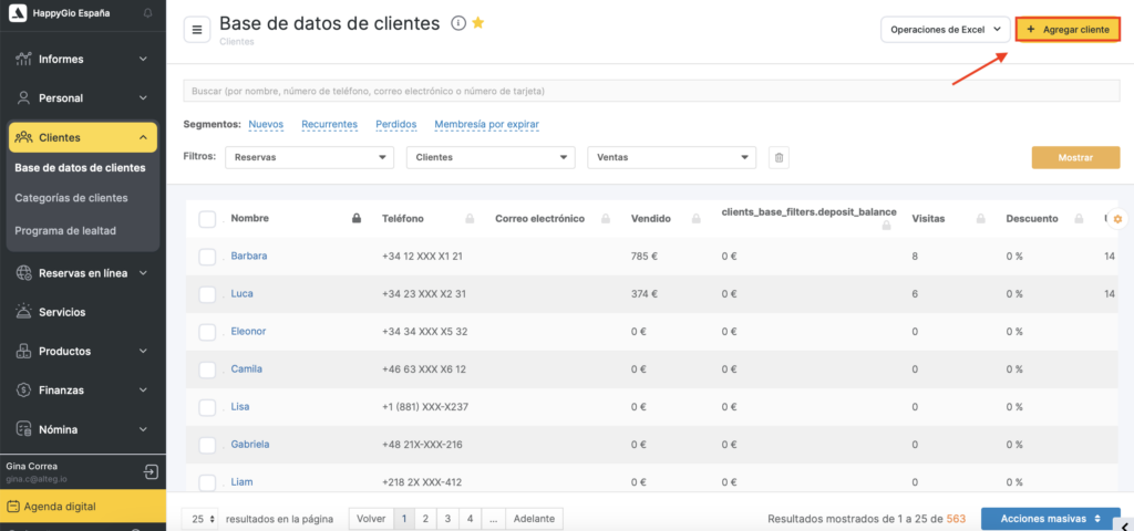 Desde la sección Clientes > Todos los clientes puedes añadir un nuevo cliente manualmente o importar una lista de clientes desde una hoja de cálculo de Excel (consulta el artículo correspondiente para más detalles).