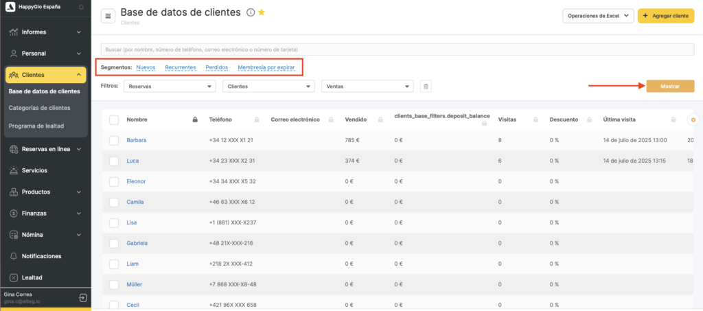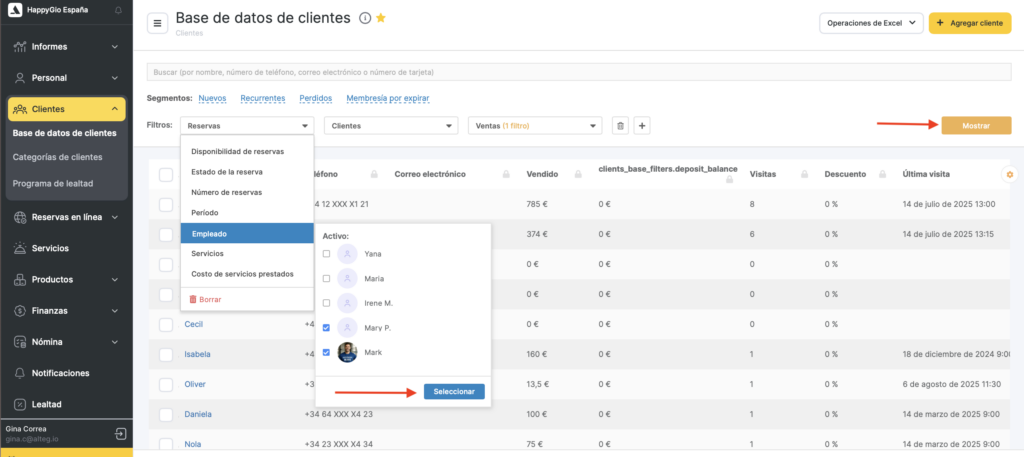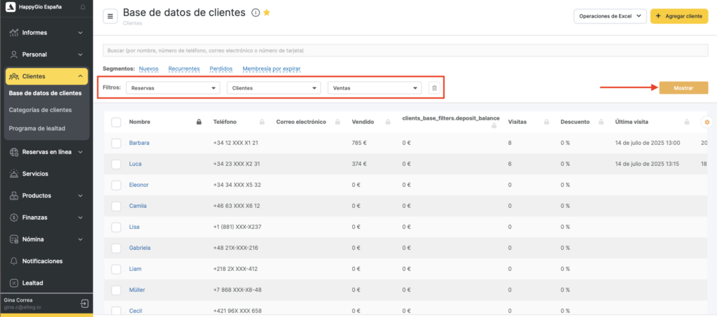 Filtra la información de los clientes según los parámetros que necesites y haz clic en Mostrar.