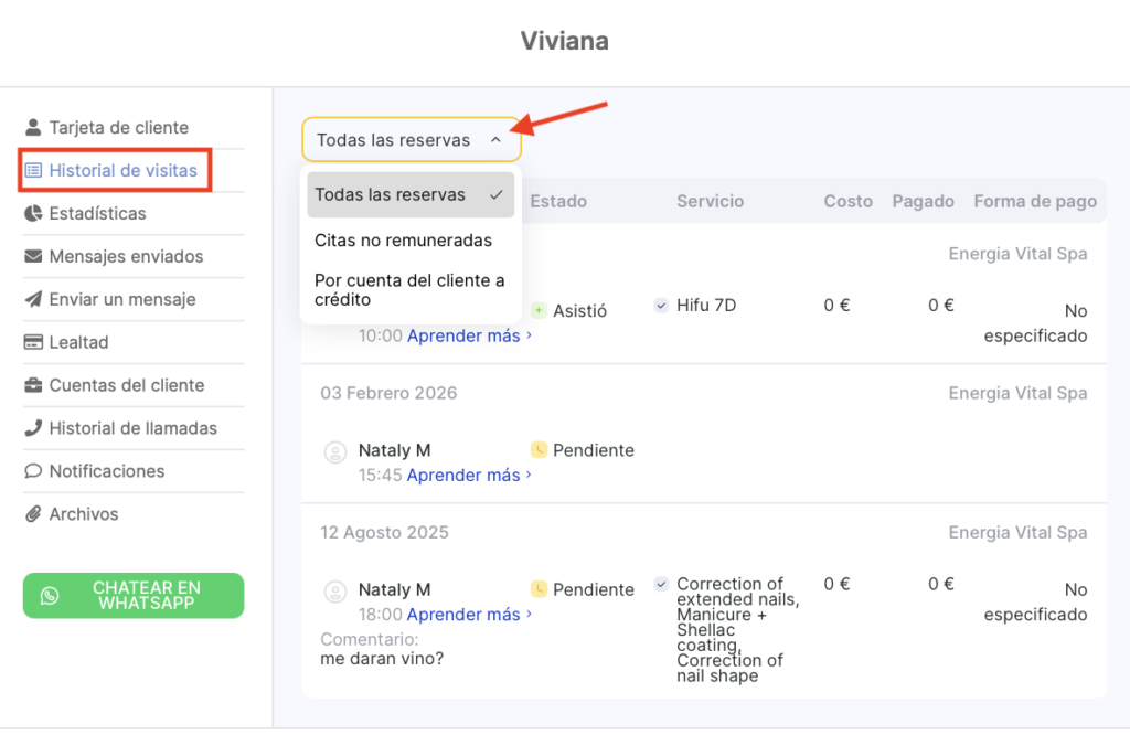 Mediante el menú desplegable en la parte superior, puedes filtrar el historial por tipo: mostrar todas las citas, solo las no pagadas o aquellas con deuda.