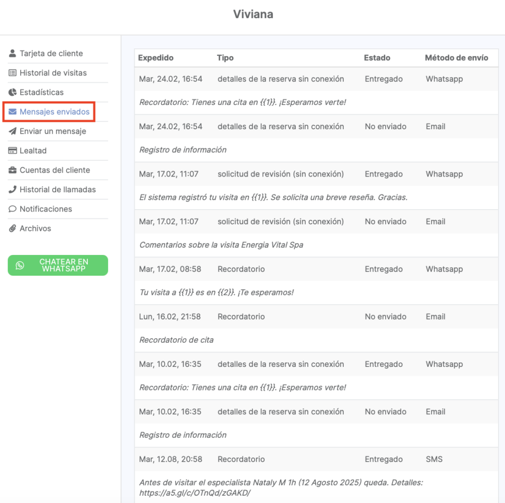 Esta sección muestra la lista de todos los mensajes enviados al cliente a través de todos los canales, incluyendo el tipo de mensaje, su estado, la fecha y hora de envío y el contenido del mensaje.
