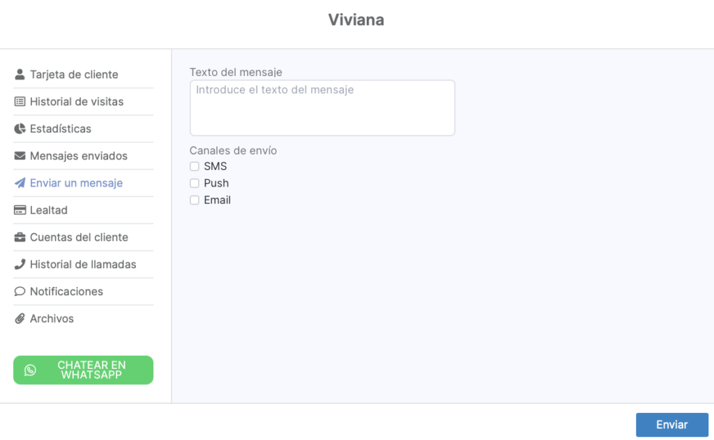 En esta sección, puedes enviar un mensaje personalizado a tu cliente utilizando tres canales diferentes: SMS, notificación push o correo electrónico.
