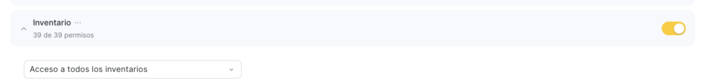 - Busca el bloque de permisos necesario y actívalo con el interruptor. Después, haz clic en el bloque Inventario y activa los permisos específicos que quieras conceder al miembro del equipo.