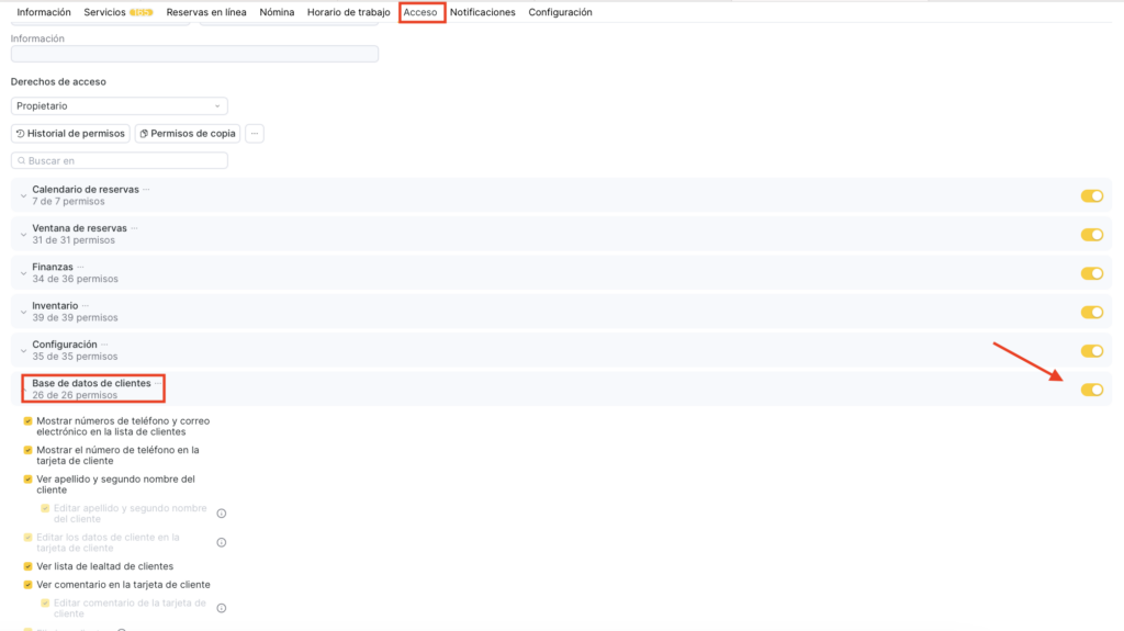 - Busca la sección de permisos necesaria y actívala con el interruptor. Después, haz clic en la sección Todos los clientes y habilita los permisos específicos que quieras conceder al miembro del equipo.