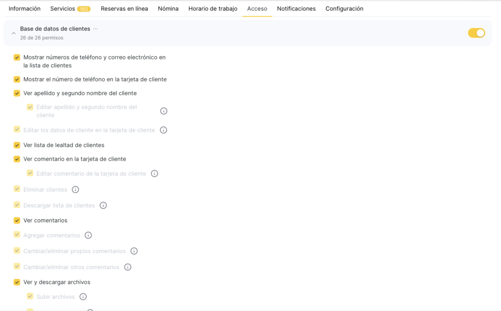 Aquí también puedes configurar un permiso para que un miembro del equipo vea únicamente los clientes que han sido atendidos por ese mismo miembro.
