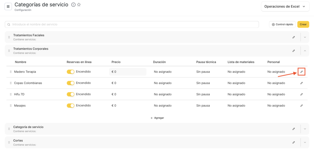 - Ve a Configuración > Configuración Principal > Servicios. Selecciona una categoría de servicio o un servicio y haz clic en el botón editar junto a su nombre.