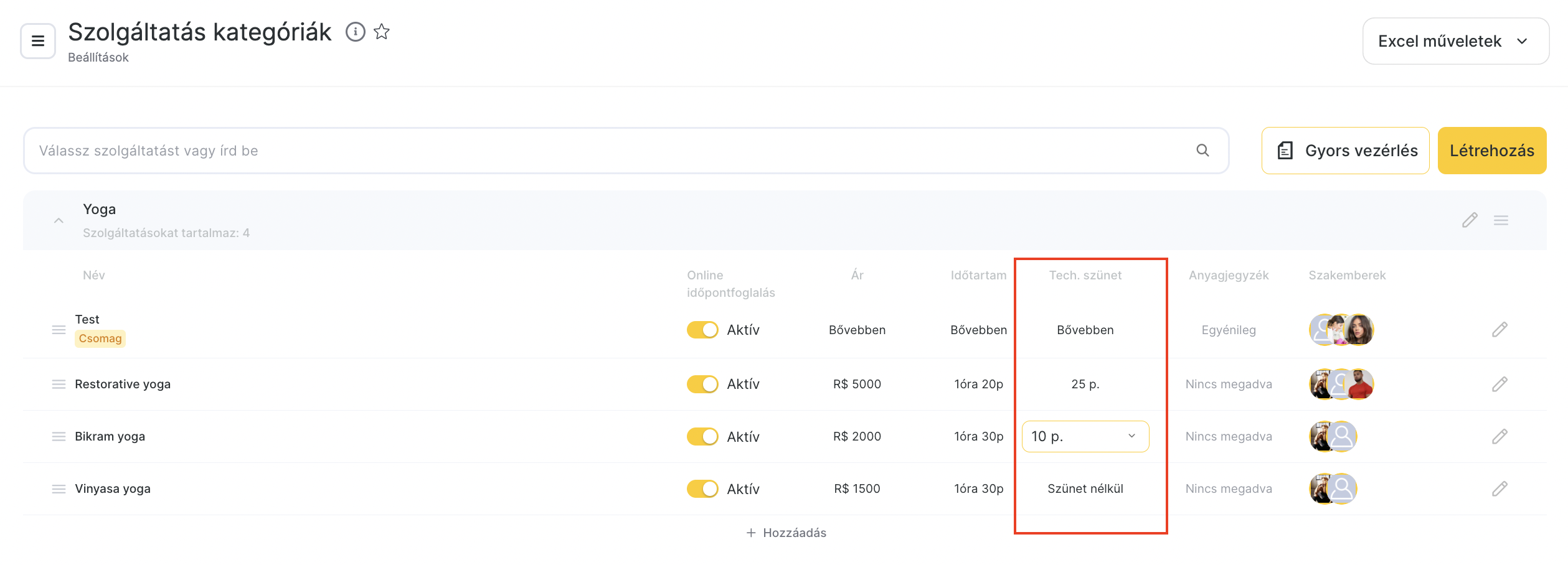Nyisd meg a kívánt szolgáltatást tartalmazó kategóriát. A szolgáltatások listájában, a Technikai szünet részben válaszd ki a szünet hosszát — 0 (nincs szünet) és 1 óra között, 5 perces lépésekben. A beállítás automatikusan mentésre kerül a kiválasztás után.