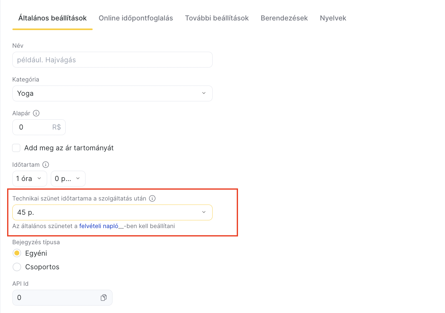 Például: Az általános szünet minden szolgáltatásra 15 perc. Ha a bejegyzés 2 szolgáltatást tartalmaz, a szünet 30 perc lesz; ha 3-at, akkor 45 perc, és így tovább. Vagy ha az egyik szolgáltatás technikai szünete 10 perc, az általános szünet pedig 15 perc, akkor két szolgáltatásnál a szünet 25 perc lesz.