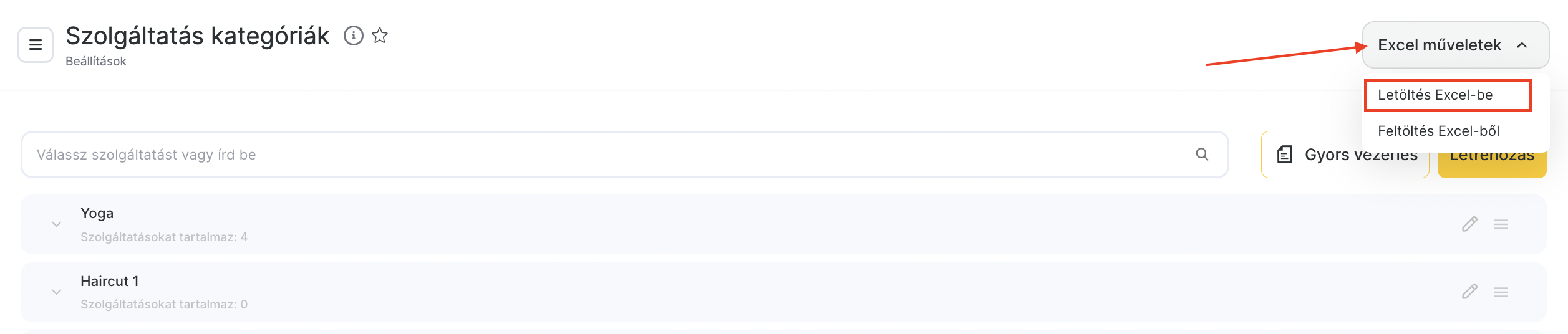 Töltsd le a szolgáltatásaid Excelbe a Excel műveletek → Letöltés Excelbe menüponttal.