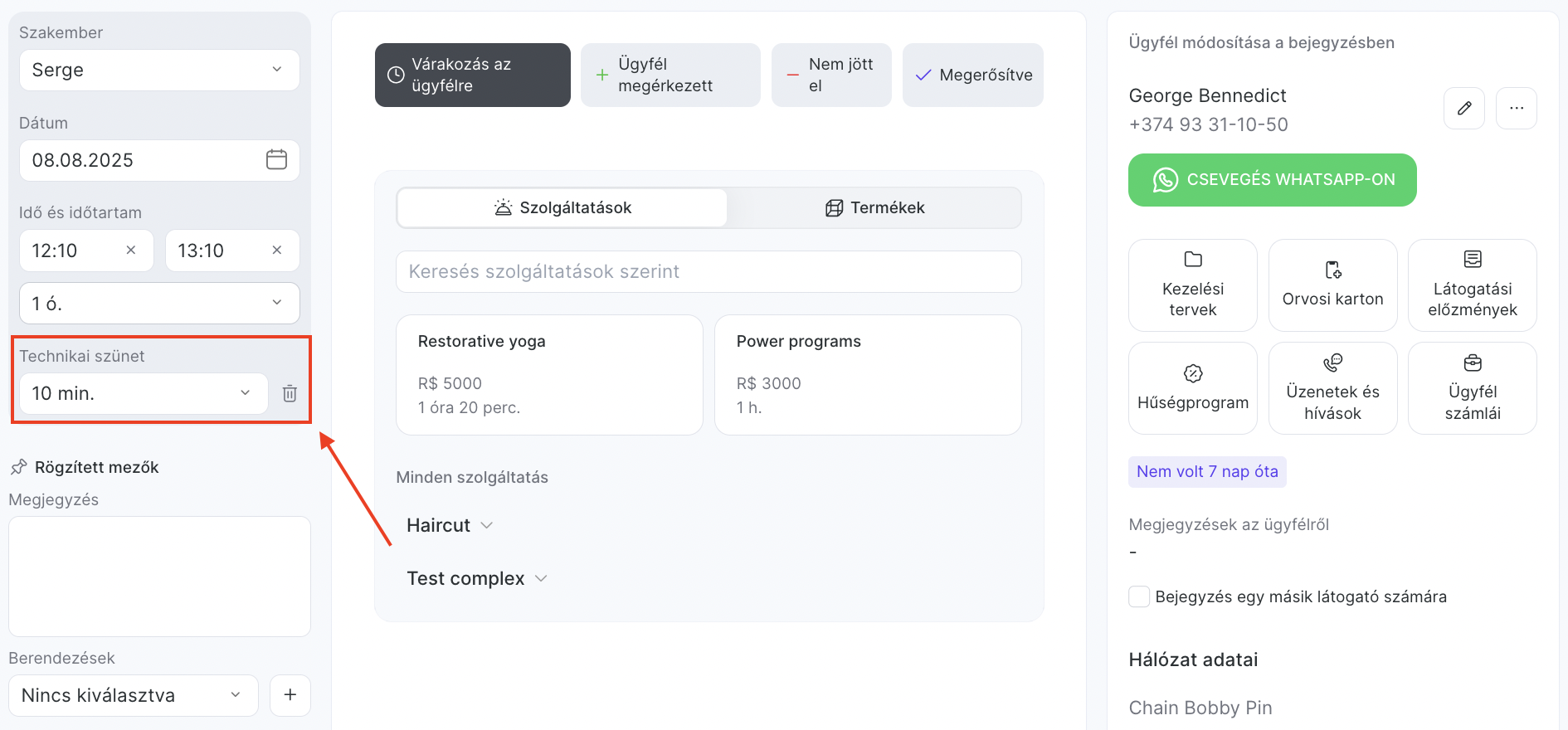 Ha a technikai szünet engedélyezve van a beállításokban, az figyelembe lesz véve a szabad időpontok megjelenítésénél, miközben az ügyfél számára a szolgáltatás hossza változatlan marad.