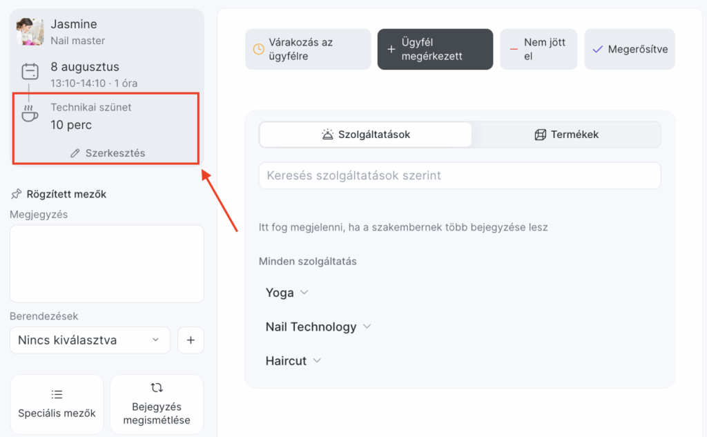 A szünet időtartamát akkor is beállíthatod, ha az időpont több szolgáltatást tartalmaz.