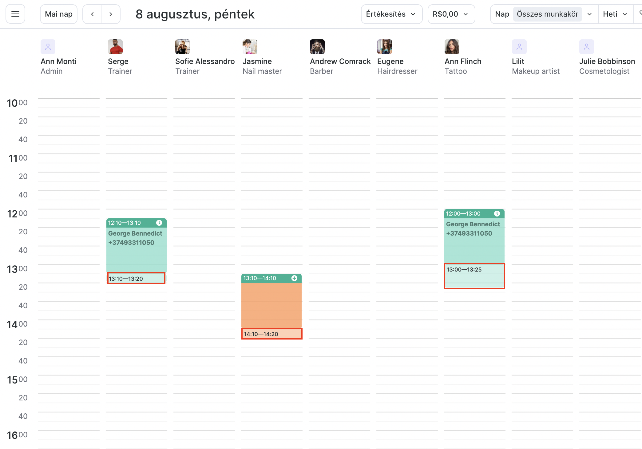 A Technikai szünet minden időpont után mezőben válaszd ki a szünet időtartamát minden szolgáltatásra vonatkozóan — 0 (nincs szünet) és 1 óra között, 5 perces lépésekben. Ez a beállítás minden bejegyzésre érvényes lesz. Szükség esetén a szünet a naptárban vagy a bejegyzési ablakban is módosítható — például kézzel változtatható vagy törölhető.