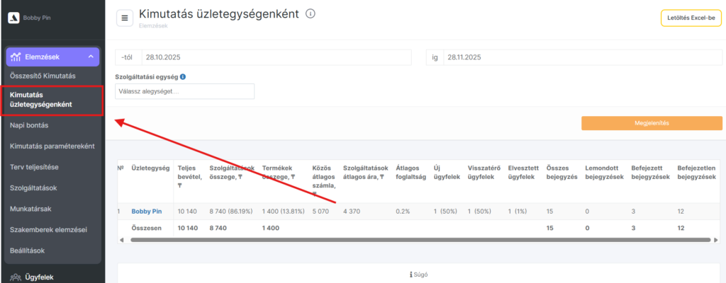 Kattints a „Letöltés Excelbe” gombra, hogy letöltsd a teljes kimutatást további elemzéshez, prezentációhoz vagy belső riportokhoz.