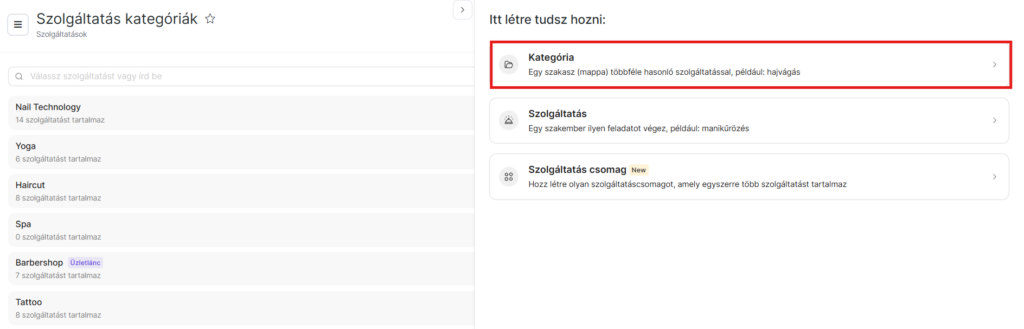 A meglévő szolgáltatások megtekintéséhez kattints a kategória nevével ellátott mappára. Ekkor megjelenik egy legördülő lista, ahol szerkesztheted, törölheted vagy új szolgáltatásokkal bővítheted a listát.