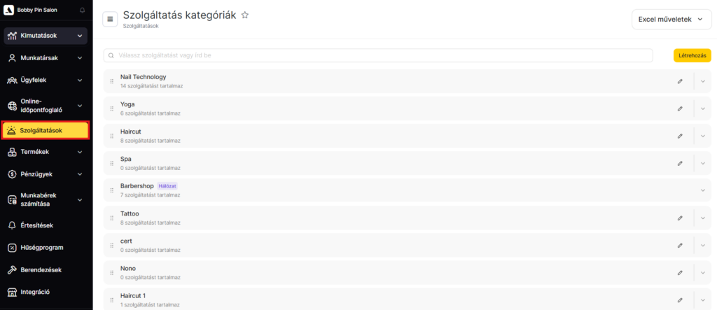 A szolgáltatásokat a kategórián belül a listában is átrendezheted. Ehhez kattints a szolgáltatás neve mellett bal oldalon található pontok ikonra, majd húzd a sort a kívánt pozícióba. Ez a sorrend jelenik meg az online időpont-foglaló widgetben és a digitális naptárban történő foglalás létrehozásakor is.