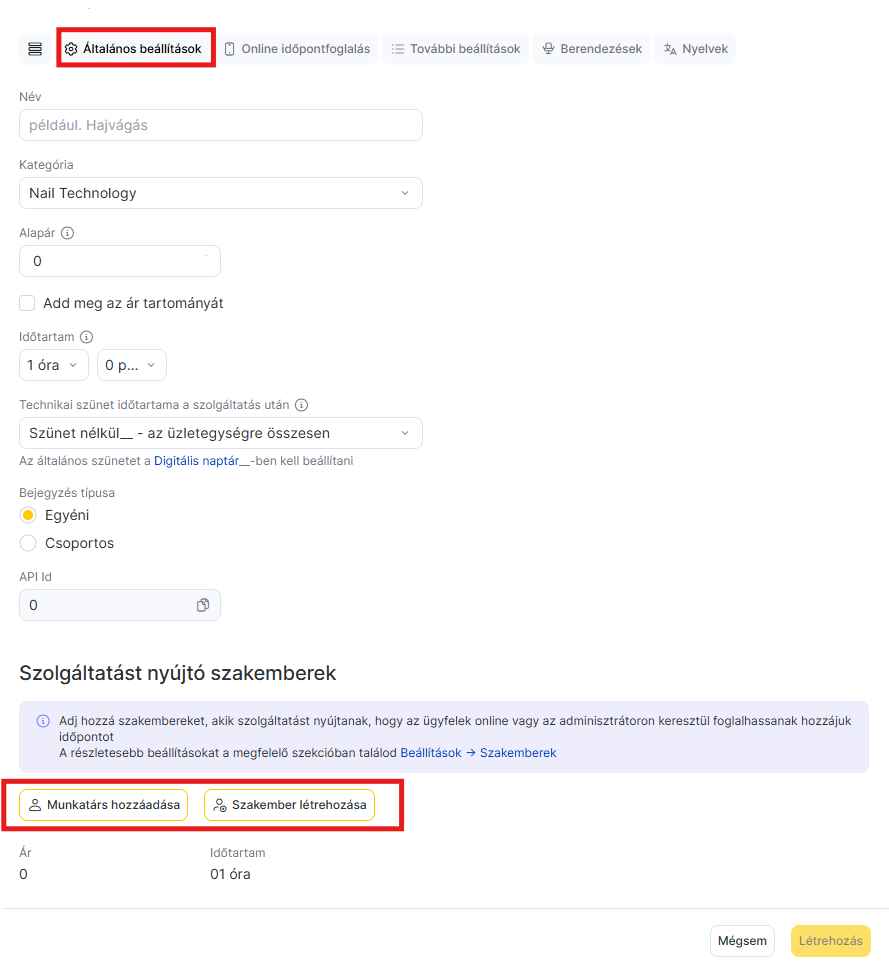- Egy munkatárs szolgáltatáshoz rendeléséhez nyisd meg a szolgáltatás beállításainál a Fő beállítások fület.