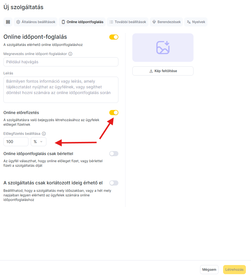 - Az online előrefizetés engedélyezéséhez kapcsold be a megfelelő kapcsolót az Online előrefizetés mezőben. Ha ez be van kapcsolva, az ügyfelek az online indőpont-foglalón ki tudják fizetni a szolgáltatást.