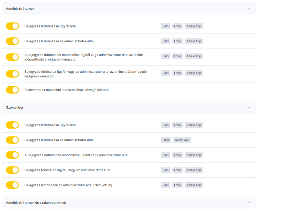 - Jelöld be azokat az értesítéseket, amelyeket a munkatárs/adminisztrátor kapni fog, valamint a küldési csatornákat (SMS, push vagy email).