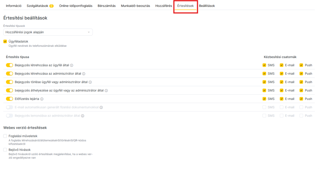 Ha további csatornákon (SMS, email, Web) is szeretnél értesítéseket küldeni, azt kizárólag manuálisan tudod beállítani a munkatárs értesítési beállításainál.