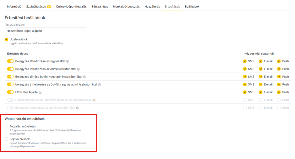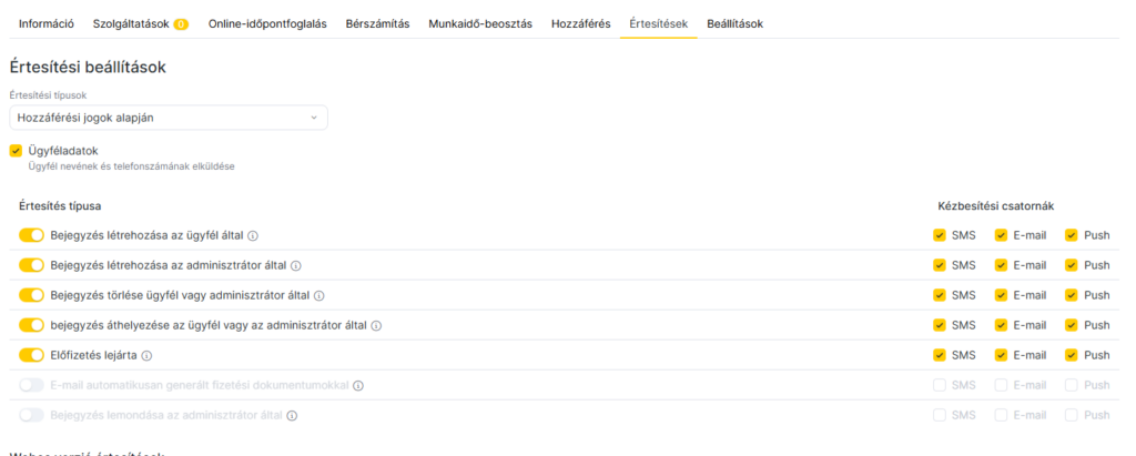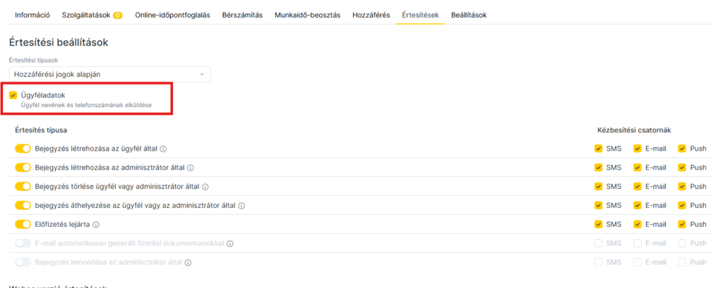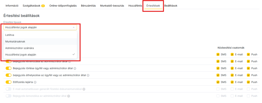 Mielőtt értesítéseket állítanál be egy hozzáféréssel rendelkező munkatársnak, engedélyezned kell a küldési csatornákat a Beállítások > Rendszerbeállítások blokk > Értesítések > Küldési csatornák menüpontban. A küldési csatornák beállításáról részletesen a kapcsolódó cikkben olvashatsz.