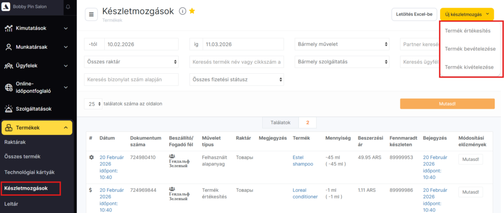 - Az Termékek > Készletmozgások menüpontban — ez a cikk ezt a módszert mutatja be.