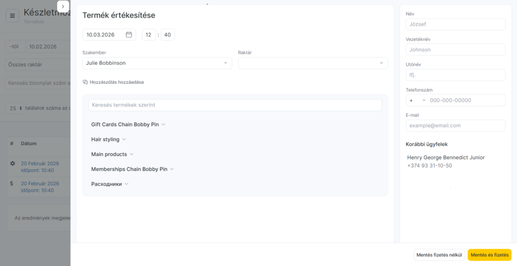 A művelet mentéséhez kattints a Mentés fizetés nélkül gombra. Ebben az esetben az értékesítés fizetés nélkül kerül rögzítésre. Ha azonnal fizetni szeretnél, kattints a Mentés és fizetés gombra.