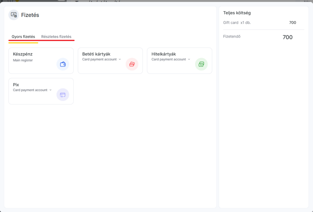 Részletfizetéshez nyisd meg a Részletfizetés fület, majd a megjelenő ablakban add meg az összegeket és válaszd ki a fizetési módokat.