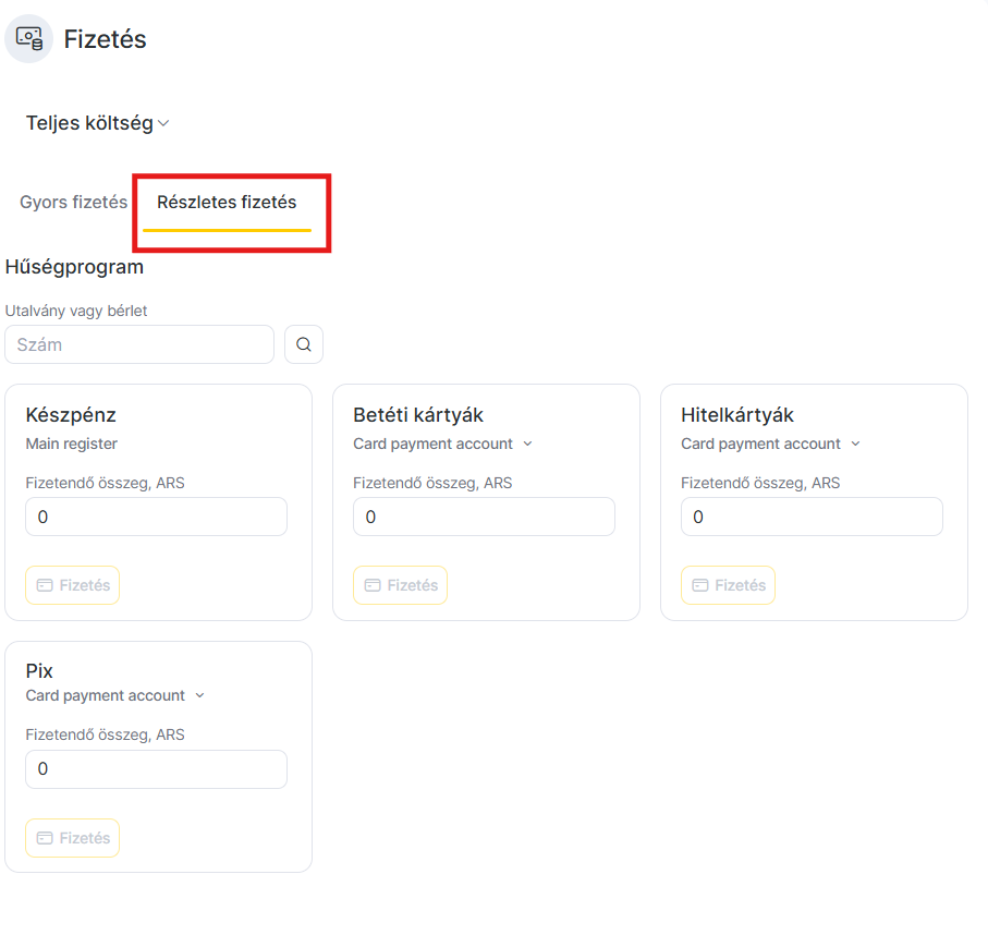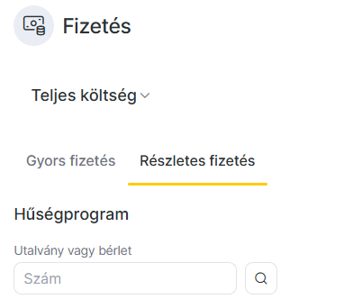 Miután továbblépsz a fizetéshez (Mentés és fizetés), a Részletes fizetés blokkban megjelennek az adott ügyfél számára elérhető hűségprogram-lehetőségek a kiválasztott termékek kifizetéséhez. Ha a maximálisan felhasználható összeget szeretnéd levonni az egyenlegből, egyszerűen kattints a megfelelő hűségtípusra.
