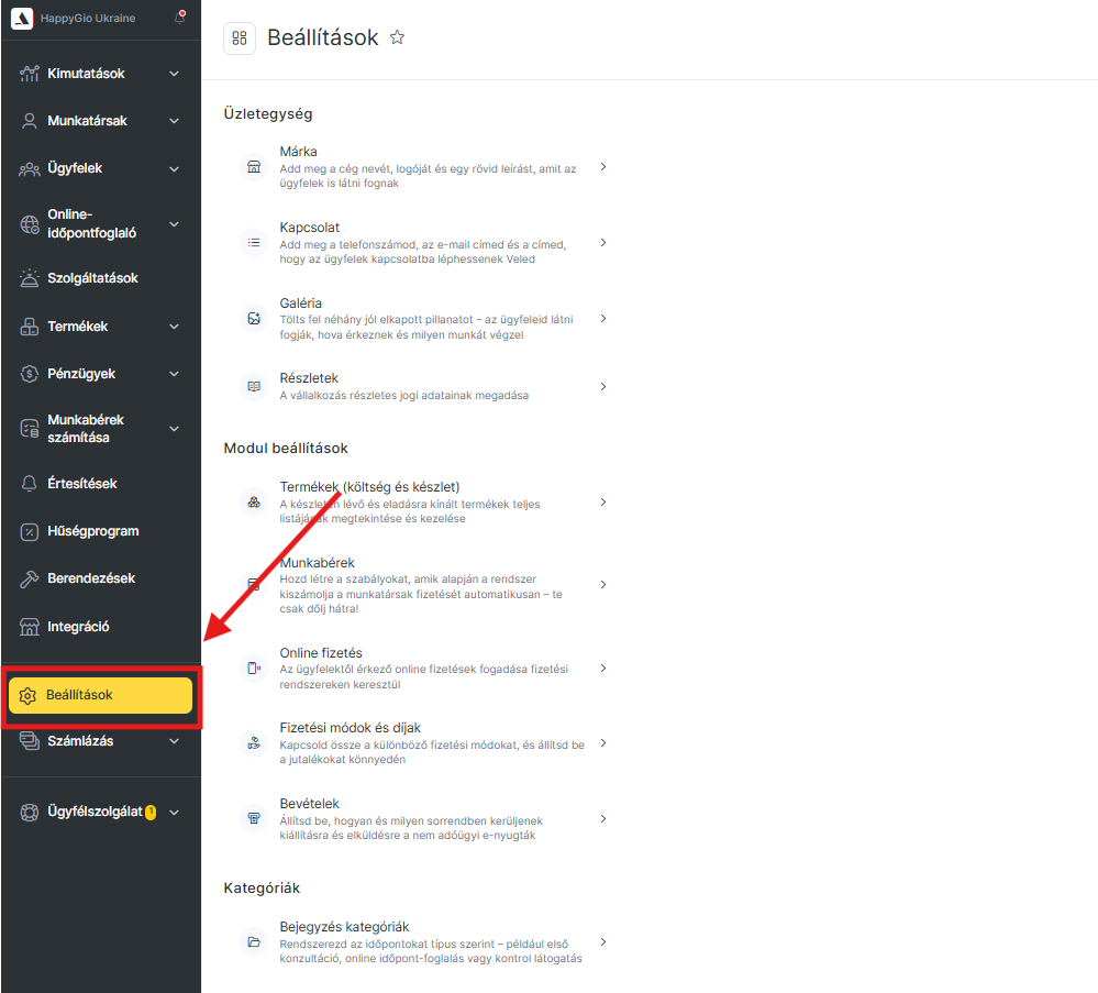 A Beállítások szekció átlátható csoportokra lett újraszervezve, így gyorsan megtalálhatod, amire szükséged van — a fiók adatoktól és arculattól kezdve a modulok (fizetések, termékek, bérek számítása) beállításain át egészen a rendszer szintű paraméterekig.