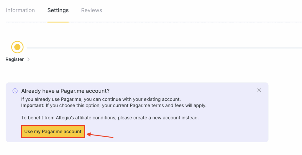 Se você já possui uma conta no Pagar.me, selecione Usar minha conta Pagar.me.