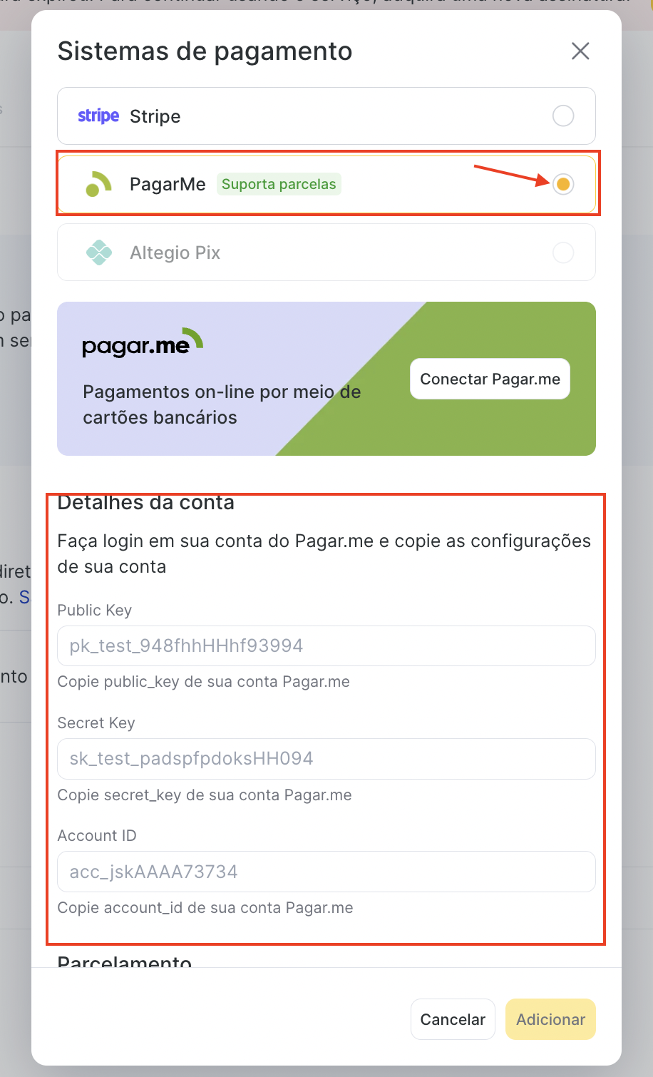 Insira seus dados e clique no botão Adicionar abaixo. Isso habilita as opções de pagamento online para seus clientes diretamente no fluxo de agendamento e checkout.