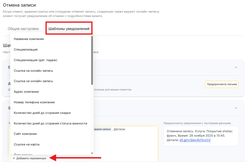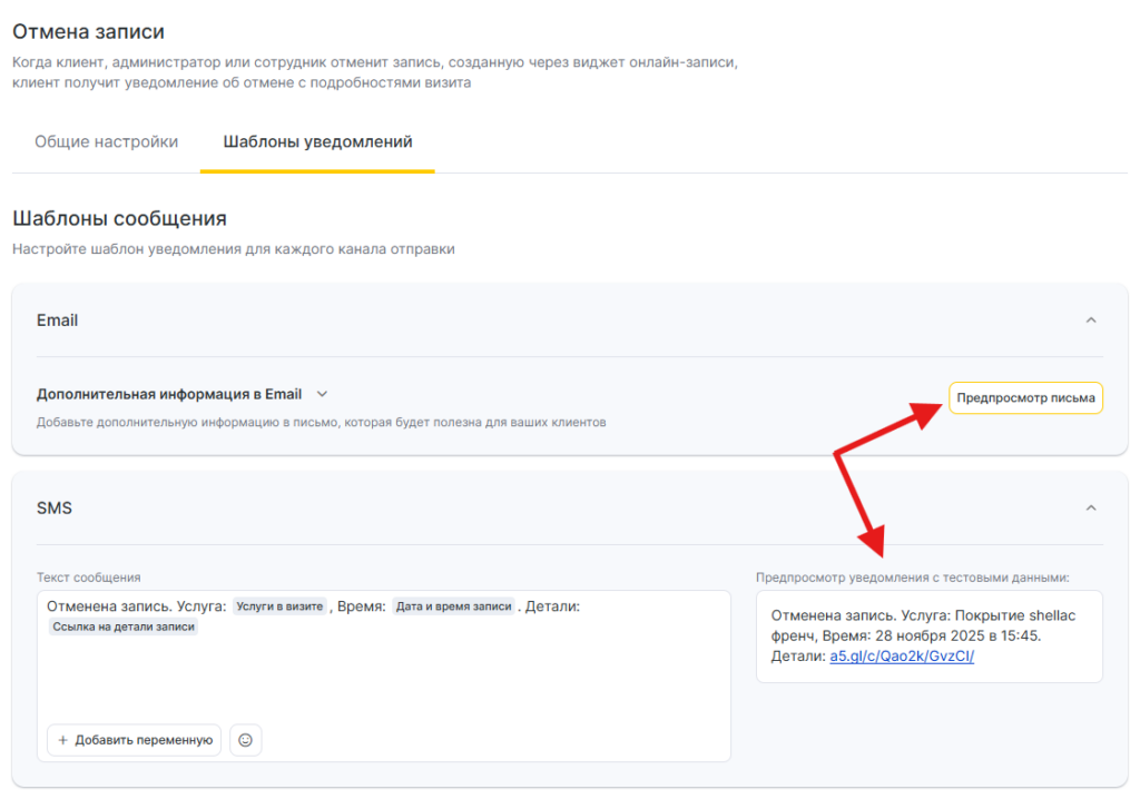 Для всех шаблонов уведомлений доступен предпросмотр — как будет выглядеть сообщение при отправке клиенту, сотруднику или администратору, с учетом переменных.
