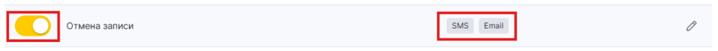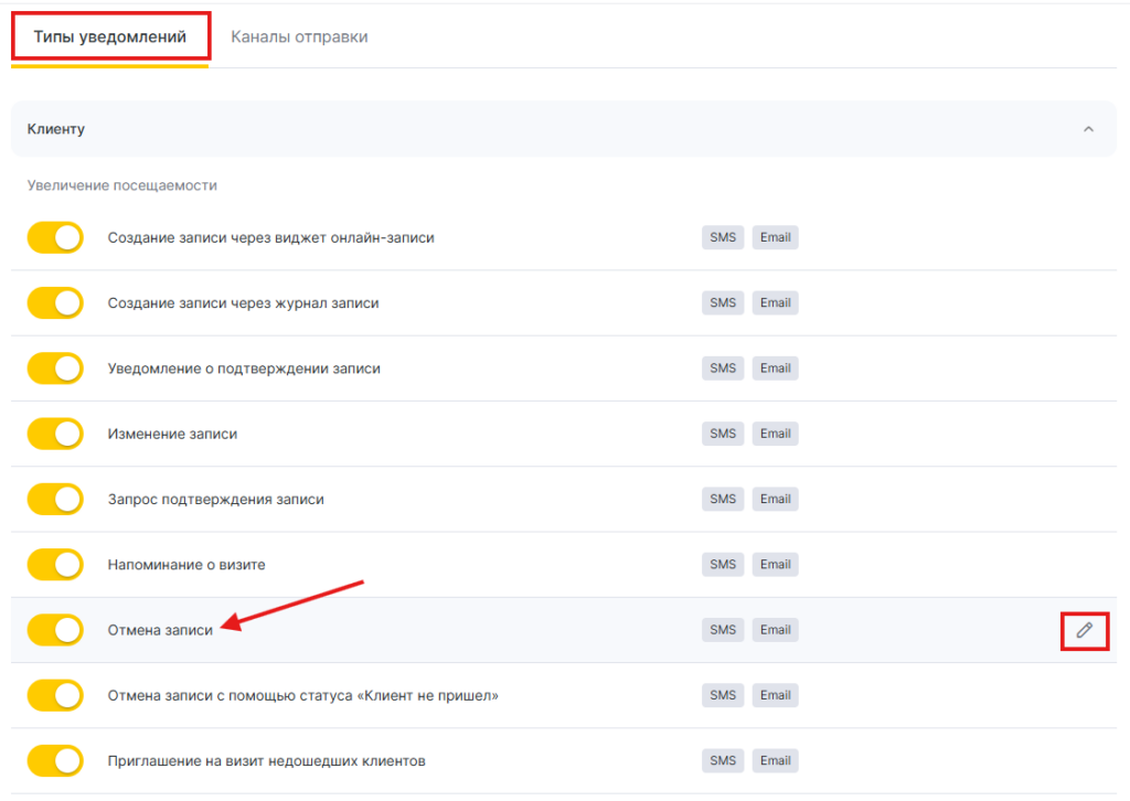 - В блоке Клиенту выберите тип Отмена записи, нажав на название уведомления или иконку карандаша.