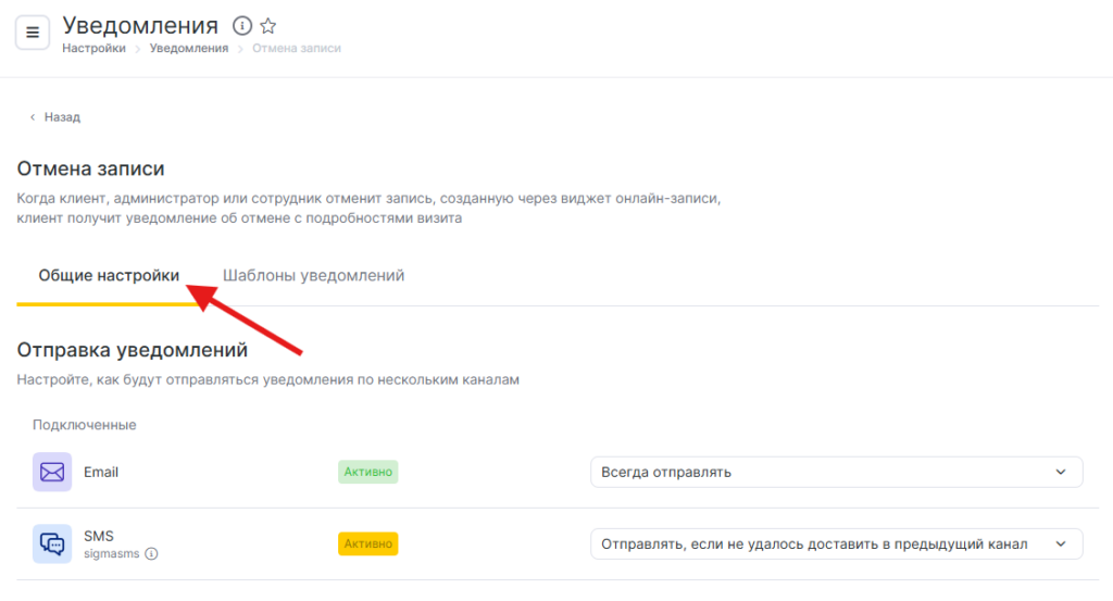 - На вкладке Общие настройки настройте, как будут отправляться уведомления по нескольким каналам. Подробнее о сценариях отправки уведомлений по разным каналам читайте в статье.