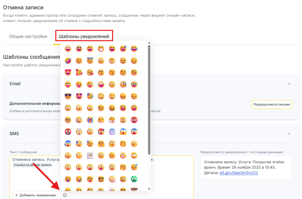 - В SMS-шаблонах уведомлений вы можете использовать Emoji смайлы, для этого нажмите на кнопку со смайлом и выберете нужный из предложенных или добавьте свой.