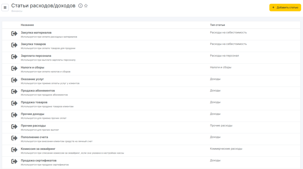 По умолчанию в Altegio задано 12 статей платежей: