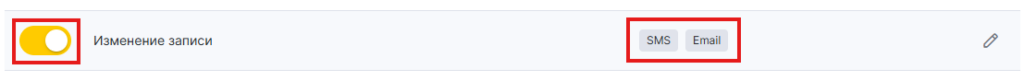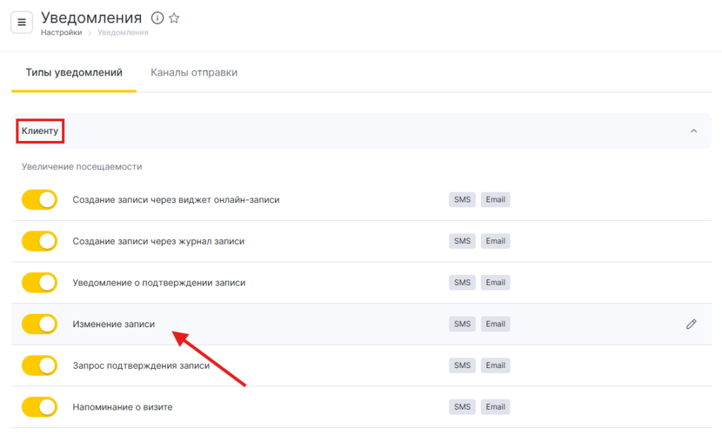 - В блоке Клиенту выберите тип Изменение записи, нажав на название уведомления или иконку карандаша.