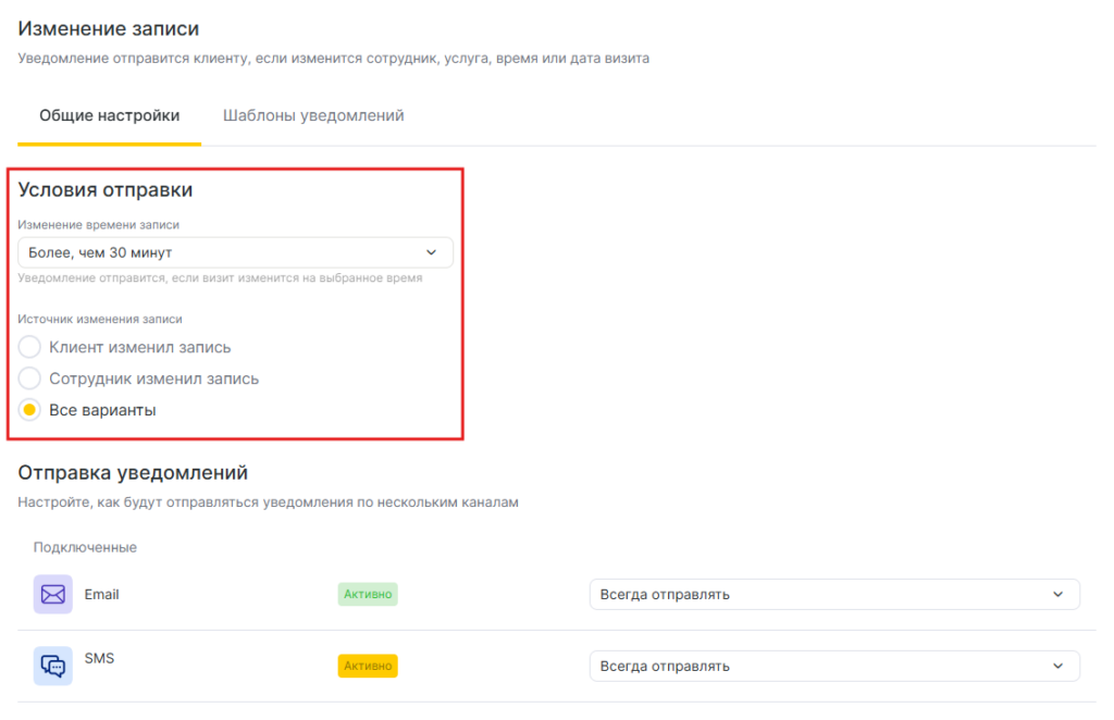 Уведомление будет отправлено клиенту сразу после изменения сотрудника, услуг, времени или даты визита. В настройках уведомления можно выбрать условия, при которых оно будет отправлено — если клиент самостоятельно перенес запись и/или запись была изменена сотрудником.