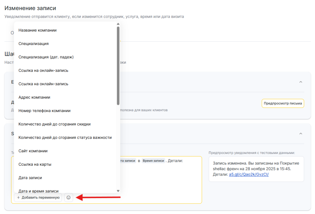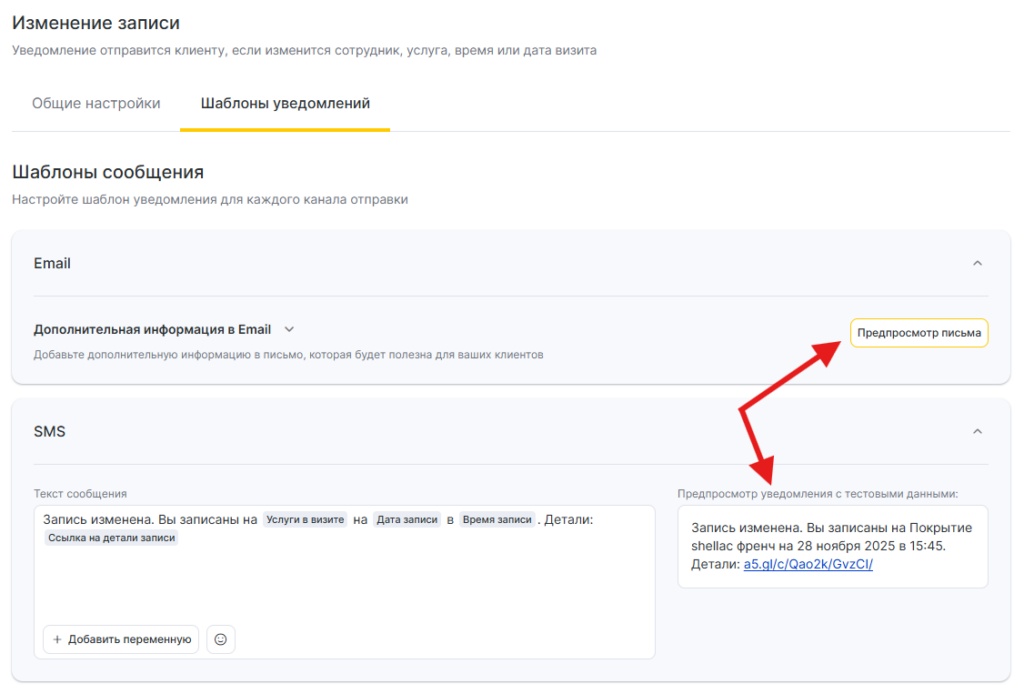 Для всех шаблонов уведомлений доступен предпросмотр — как будет выглядеть сообщение при отправке клиенту, сотруднику или администратору, с учетом переменных.