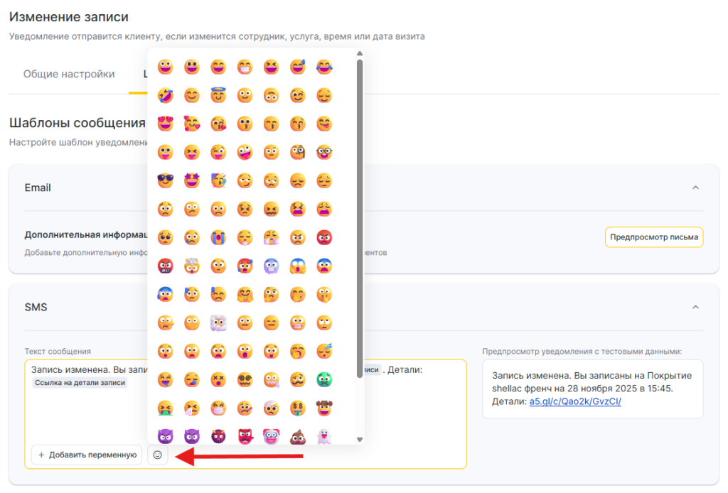 - В SMS-шаблонах уведомлений вы можете использовать Emoji смайлы, для этого нажмите на кнопку со смайлом и выберете нужный из предложенных или добавьте свой